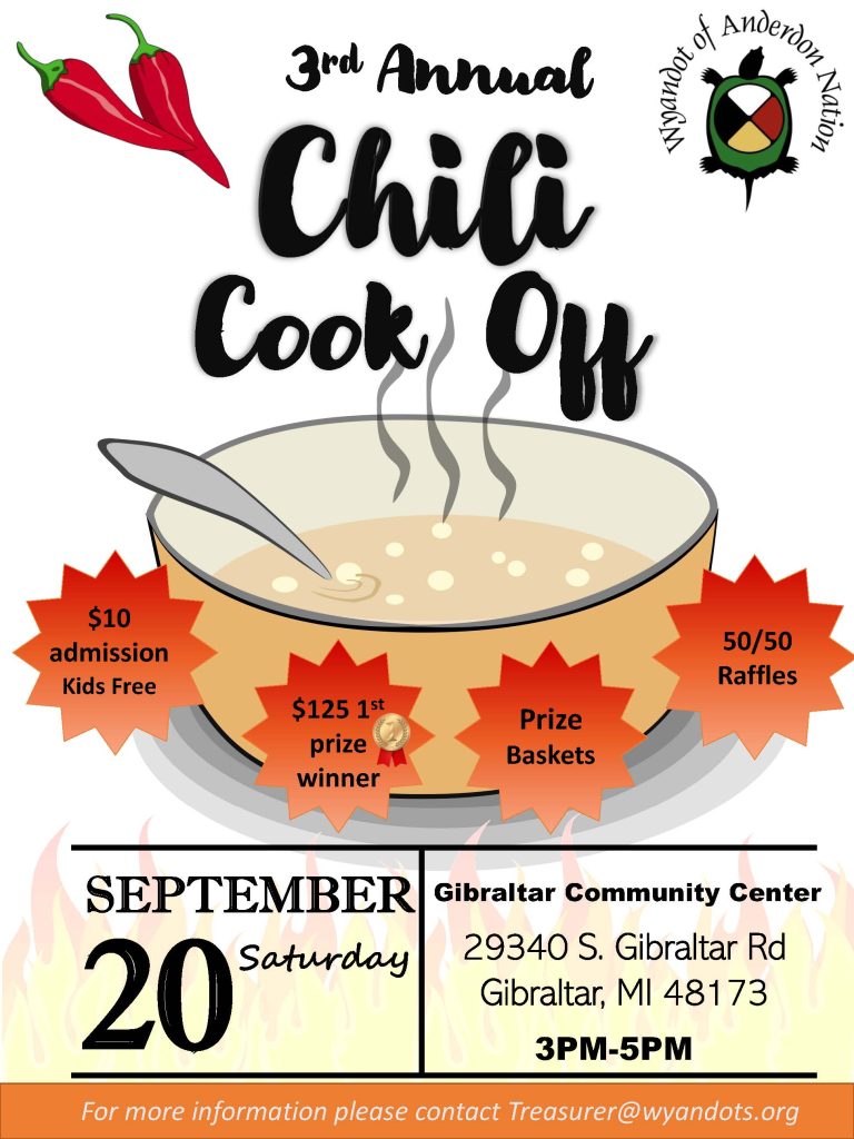 Enjoy a day of fun, flavor, and community with delicious chili, exciting raffle baskets, a 50/50 drawing, and a silent auction full of great items. Don’t miss your chance to win DoorDash gift cards and more while supporting the Wyandot of Anderdon Nation!